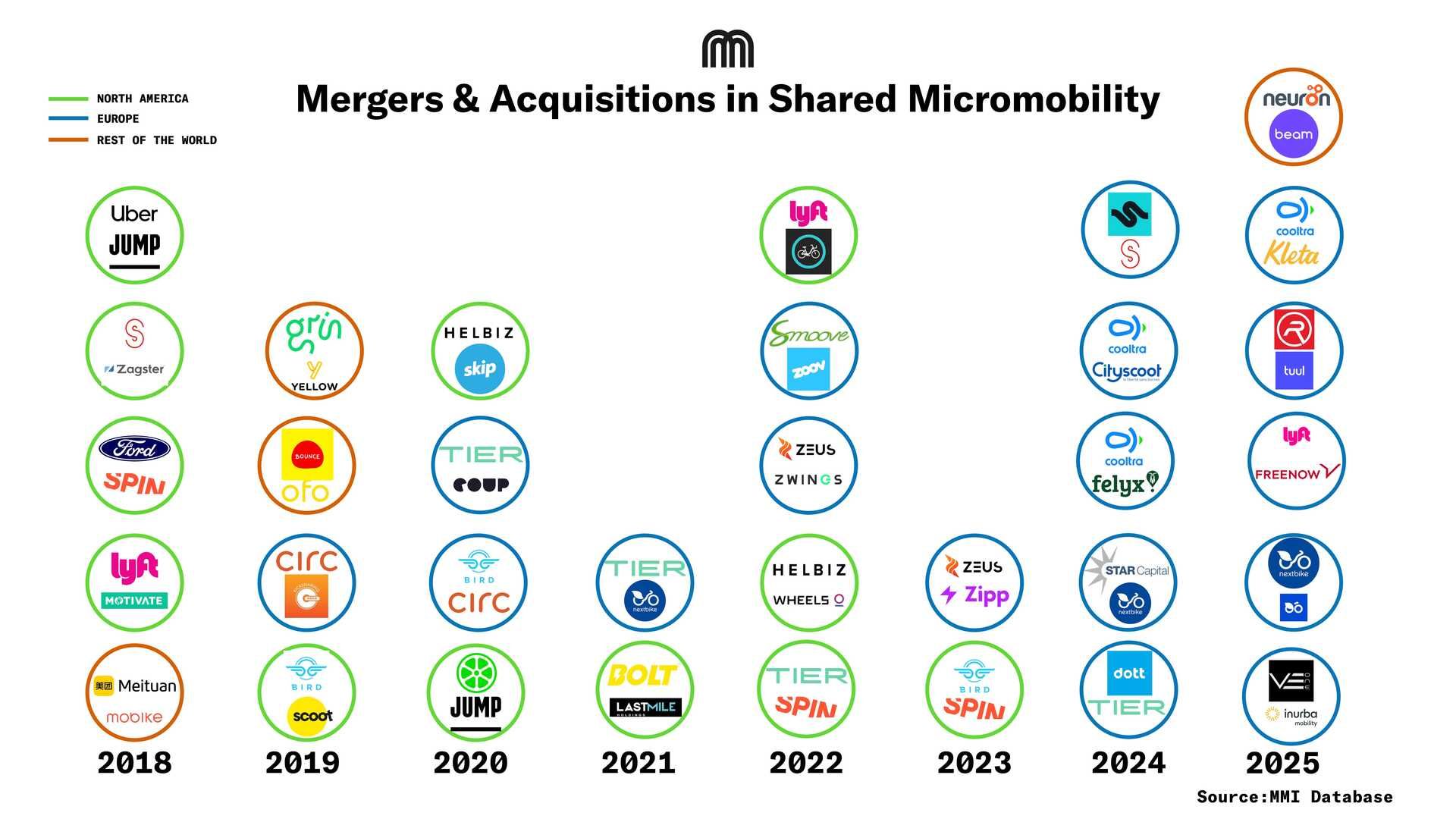 Recap of M&A deals in shared micromobility. It shows the consolidation the industry experienced during the past two years. My forecast is for more consolidation: big multinational players, now reaching profitability, will acquire smaller regional companies to facilitate entrance into new geographies / verticals.