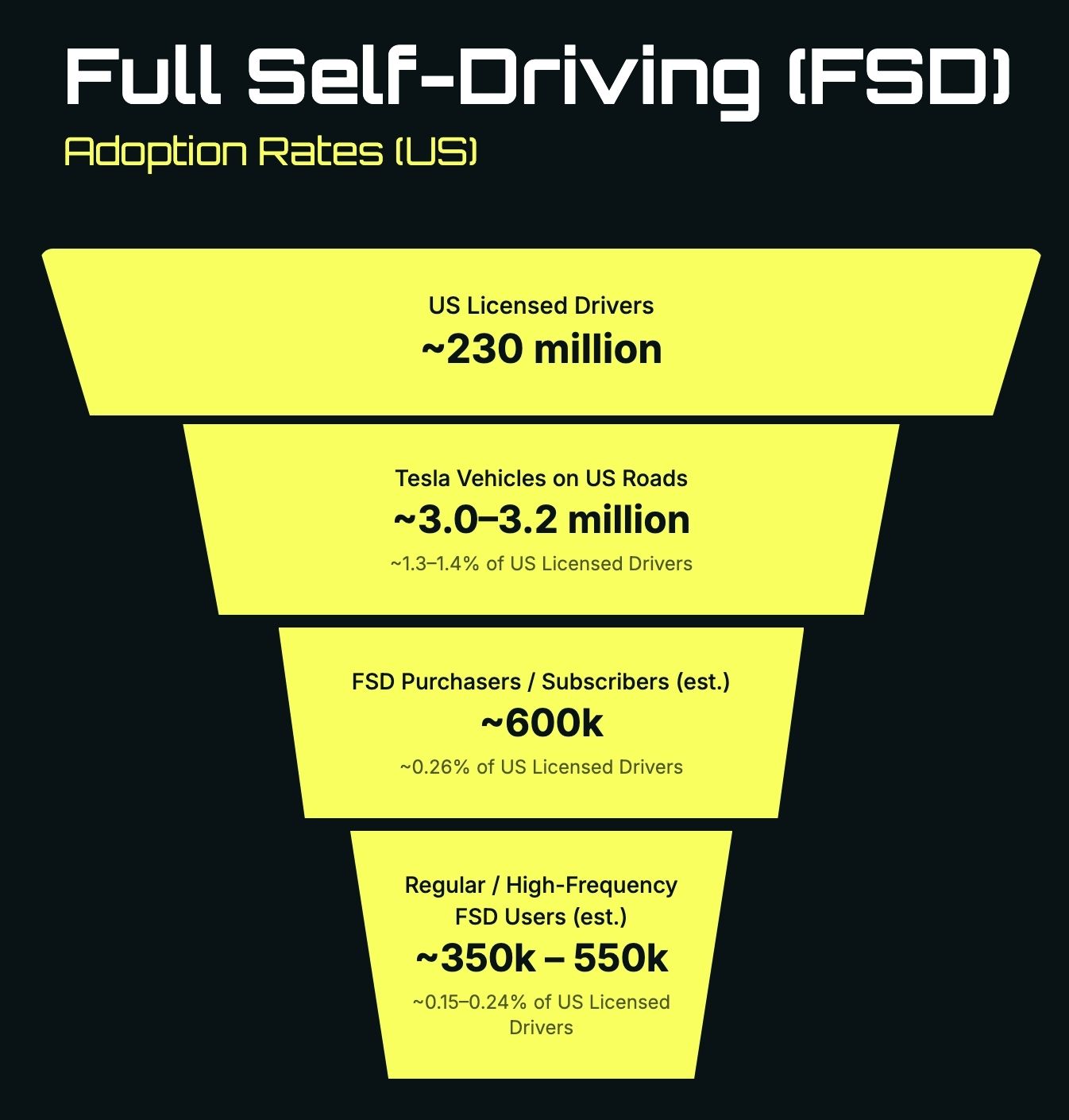 Ride AI did the math and estimated that there are 600,000 FSD owners in the US, of those 350k-550k are regular/high frequency users - or 0.2% of all US licensed drivers.