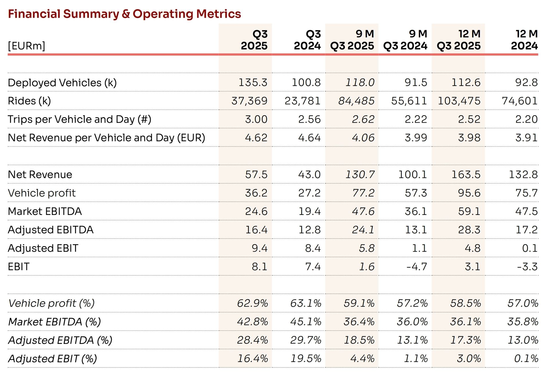 Net revenue €57.5M (+34% YoY), fueled by 135.3 vehicles (+35% YoY) and 37k rides (+57% YoY)