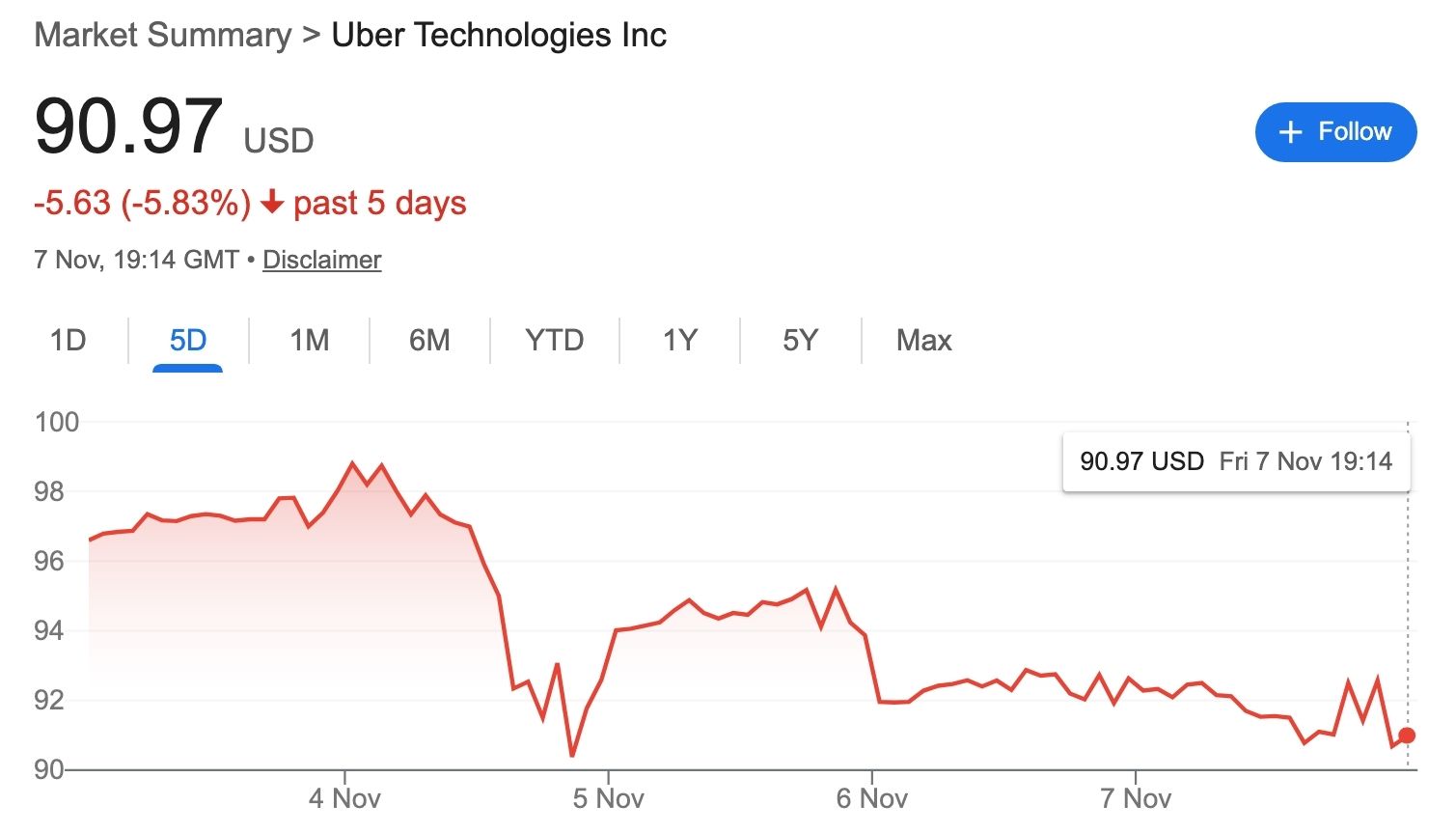 Uber showed weak profits this quarter, which the company attributes to undisclosed legal and regulatory matters; the stock market sent the stock down by circa 8%.