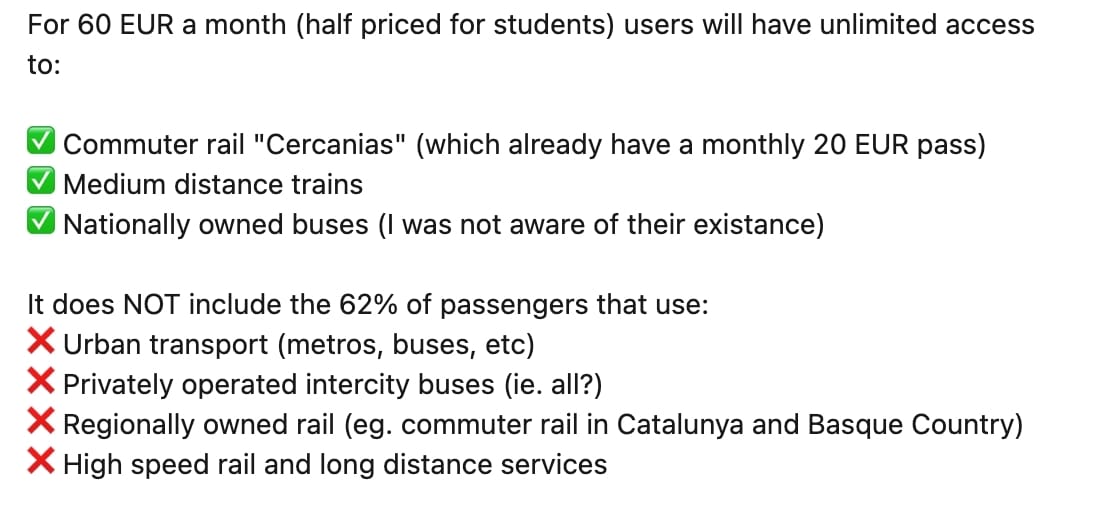 Spain to launch €60 monthly nationwide public transport pass, early in 2026. It is far from perfect, as Azarel Chamorro writes: