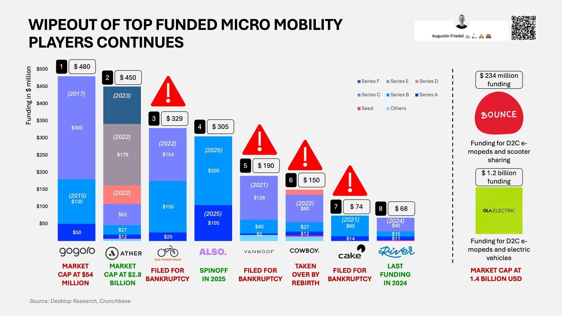 Western e-bike manufacturers have not had much success. This week we learn that Rad Power Bikes, which over its lifetime raised a total of over $300M, filed for Chapter 11 bankruptcy; and that Cowboy found a new home with ReBirth Group Holding, which also owns cycling brands Peugeot, Gitane, and Solex. Augustin Friedel summary and visuals: