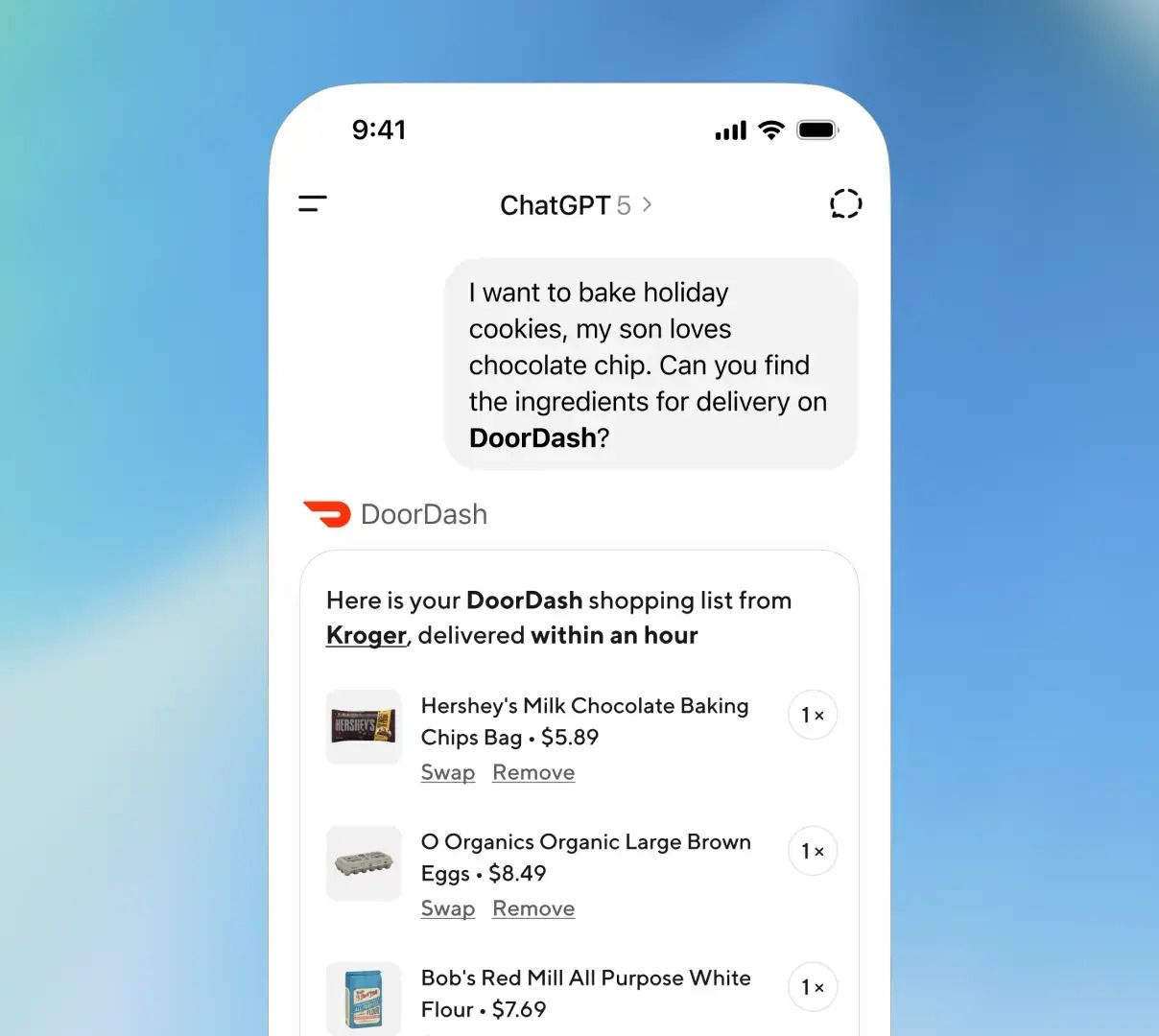 DoorDash launches a grocery shopping app within ChatGPT - enabling customers to turn recipes into grocery orders.